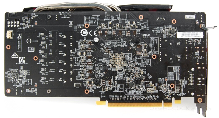 При изучении обратной стороны можно отметить наличие одного разъема питания на djctvm контактов, который развернут защелкой вверх. Нет разъемов для CrossFire, но Polaris они не нужны, обмен данных происходит через шину PCI-E. А вот GeForce GTX 1060 официально SLI не поддерживают, то есть работают только в одиночном режиме.