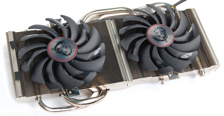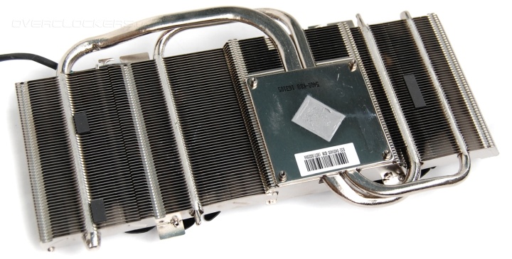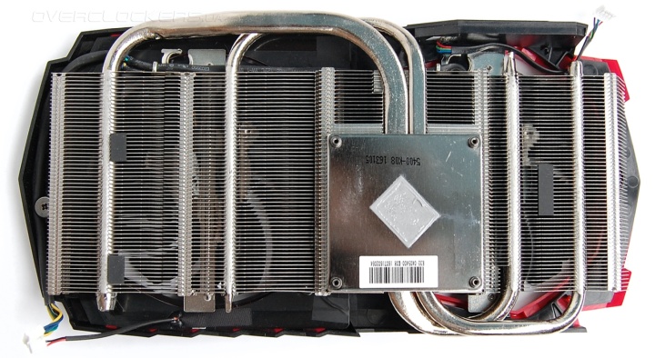 Конструкция системы охлаждения в целом напоминает охлаждение старших моделей. Но в данном случае мы видим только две тепловые трубки, зато большого диаметра. Контакт с поверхностью графического кристалла осуществляется через массивное основание.