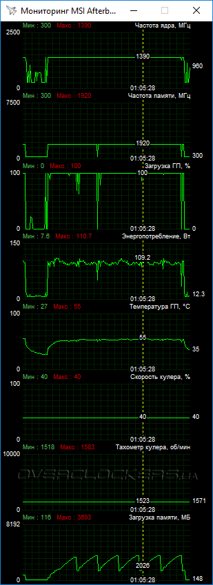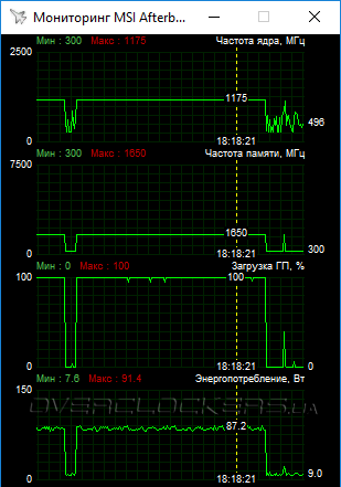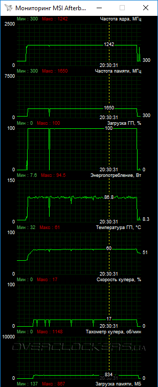 С разгоном у MSI тоже все отлично. Gaming показал неимоверно высокие результаты. Удалось достигнуть 1390 МГц по ядру при небольшом повышении напряжения на 12 мВ. Более серьезное повышение напряжения снижало стабильность. Итоговый результат разгона GPU Polaris самый высокий среди всех представителей этого семейства, прошедших через наши руки. Но надо отметить, что реальная разница в производительности между 1360 МГц и 1390 МГц была мизерной. Возможно, какие-то внутренние механизмы ограничения мощности сдерживают потенциал или масштабирование производительности упирается в другие факторы. Память тоже не подвела, удалось достигнуть 7680 МГц, что для Radeon RX 470 весьма хороший результат.