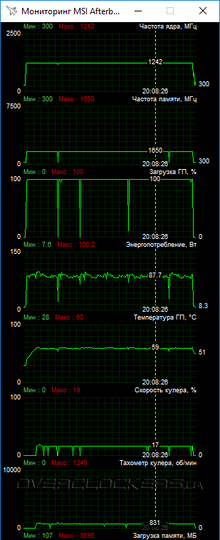 Видеоадаптер работает на повышенных частотах. По умолчанию частота ядра 1242 МГц вместо 1206 МГц. Память GDDR5 работает при эффективной частоте обмена данными 6600 МГц.