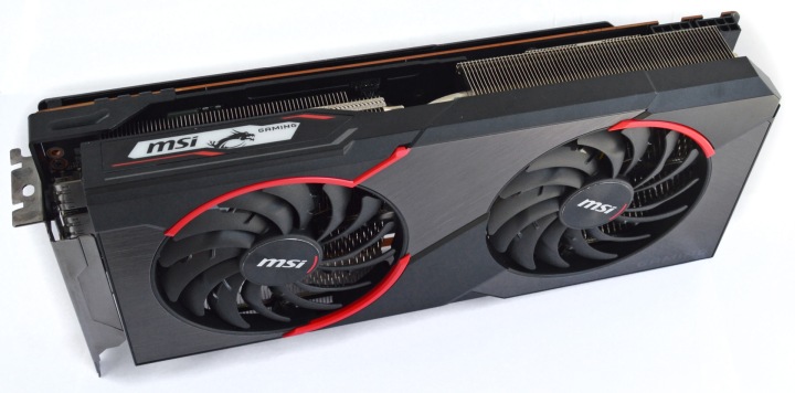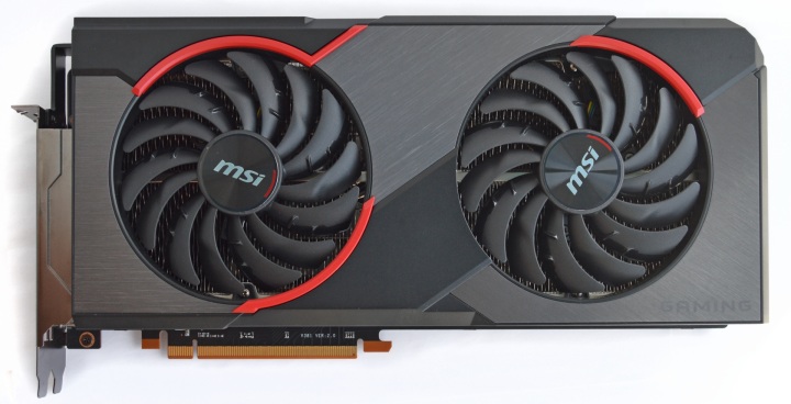 Перед нами крупное устройство длиной 30 см. Массивное охлаждение закрыто кожухом нового дизайна, который сочетает черные и серые элементы. Есть красные вставки вокруг вентиляторов.