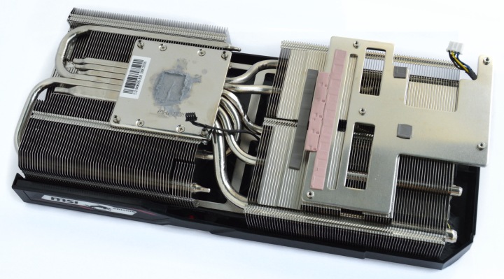 Посмотрим на устройство системы охлаждения. При снятии основного радиатора мы видим пластину, которая накрывает микросхемы памяти и некоторые элементы питающей цепи. Примечательно, что сверху на пластине три розовые термопрокладки, которые упираются в ребра основного радиатора или в тепловые трубки. То есть основной кулер тоже снимает часть тепловой нагрузки.