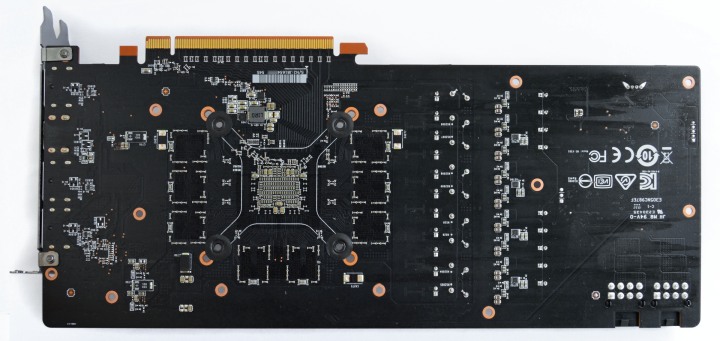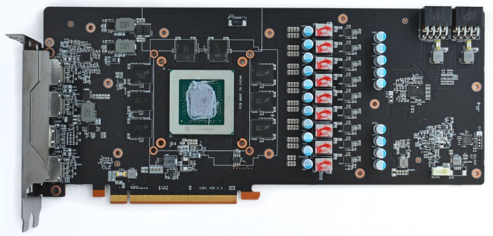 Приятно отметить, что и задняя пластина участвует в охлаждении. В районе GPU и чипов GDDR6 есть плотные термопрокладки, которые позволяют отводить тепло от текстолита.