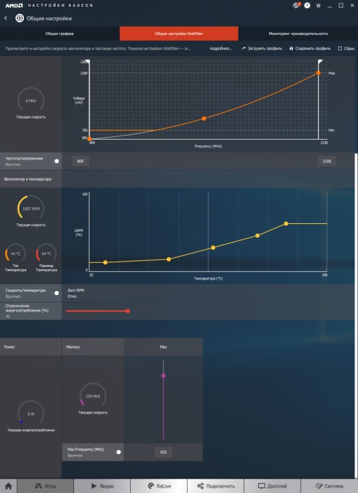 С таким отличным охлаждением есть надежды на лучший разгон, и они оправдались. Все операции по разгону осуществлялись нами через программные возможности приложения Wattman, которое входит в стандартное приложение «Настройки Radeon». Пиковая точка Boost была повышена с 2024 до 2100 МГц при сохранении начального максимального напряжения до 1,2 В. Память удалось разогнать до 935 (14960) МГц, далее начинались артефакты. Также повышен до максимума лимит мощности. В большую сторону откорректирована кривая оборотов вентилятора, чтобы обеспечить лучшее охлаждение.