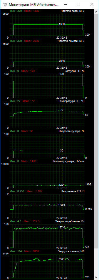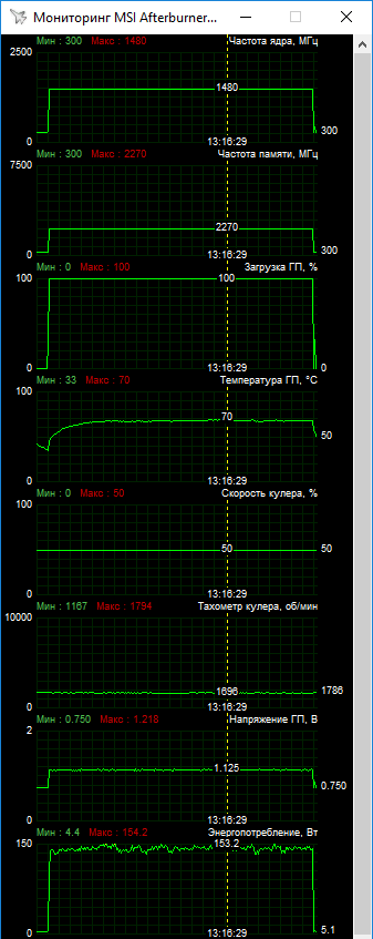 Для поддержания стабильности и нормального температурного режима скорость вентиляторов была зафиксирована на 50% (около 1700 об/мин). В таком режиме видеокарта оказалась шумнее, чем можно было ожидать, но без серьезного гула.