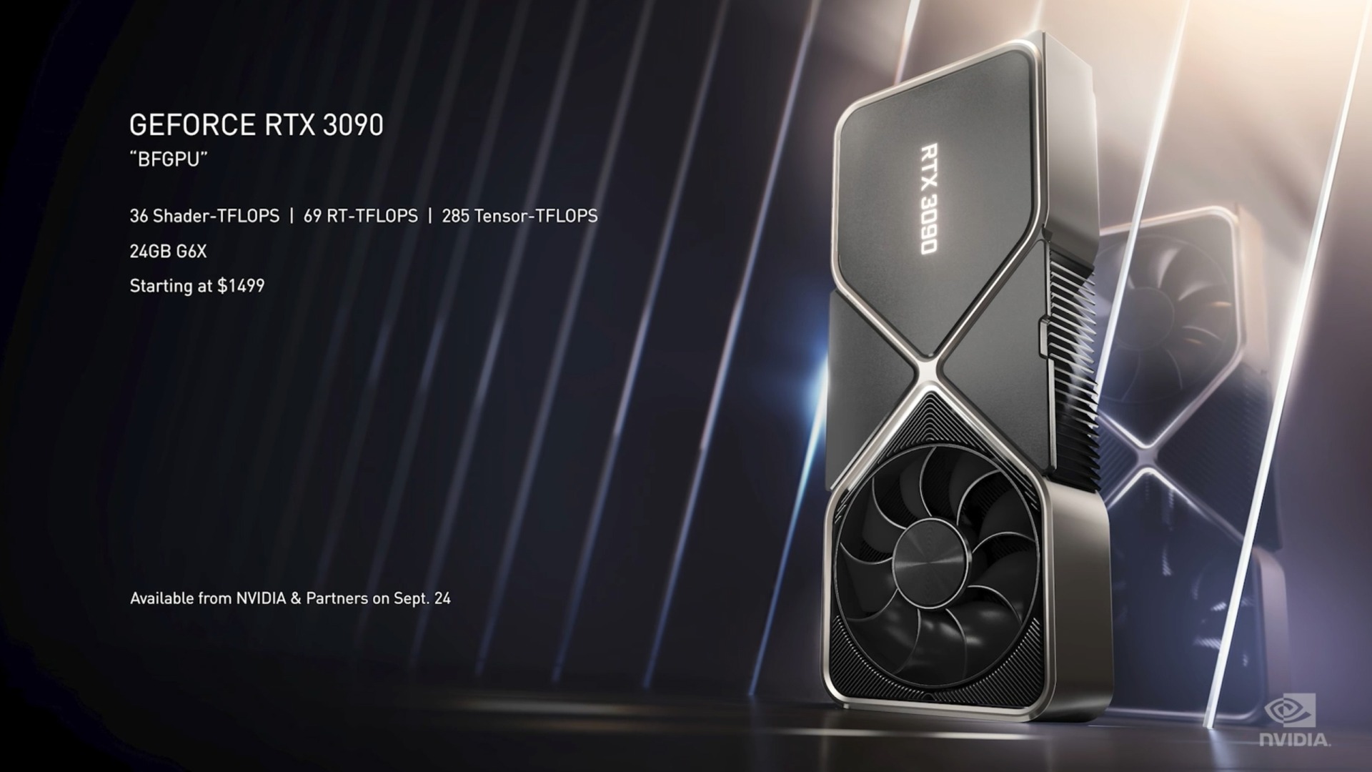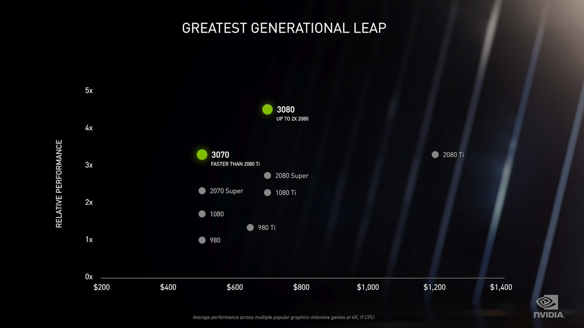 Пока нам представлено три видеокарты — GeForce RTX 3090, GeForce RTX 3080 и GeForce RTX 3070. И все они должны превзойти по производительности GeForce RTX 2080 Ti, даже младшая из названных моделей. А для GeForce RTX 3080 заявлено двукратное превосходство над GeForce RTX 2080.