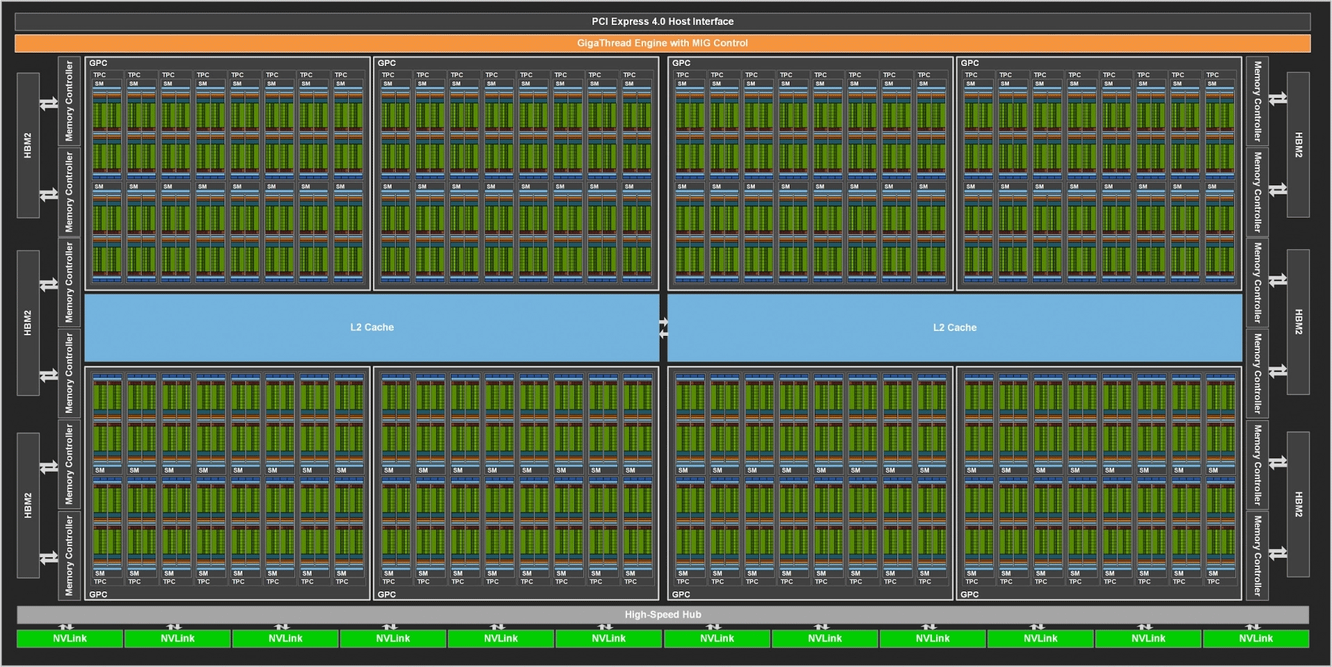 Это специализированное устройство для высокопроизводительных систем. В основе его находится графический процессор A100 с 8192 ядрами CUDA, но рабочие версии GPU оперируют 6912 потоковыми ядрами. Специально для игрового направления разработанный GPU GA102 стал основной для GeForce RTX 3090 и GeForce RTX 3080. GPU A100 насчитывал 128 мультипроцессорных блоков SM по 64 вычислительных ядра и 4 обновленных тензорных ядра в каждом.