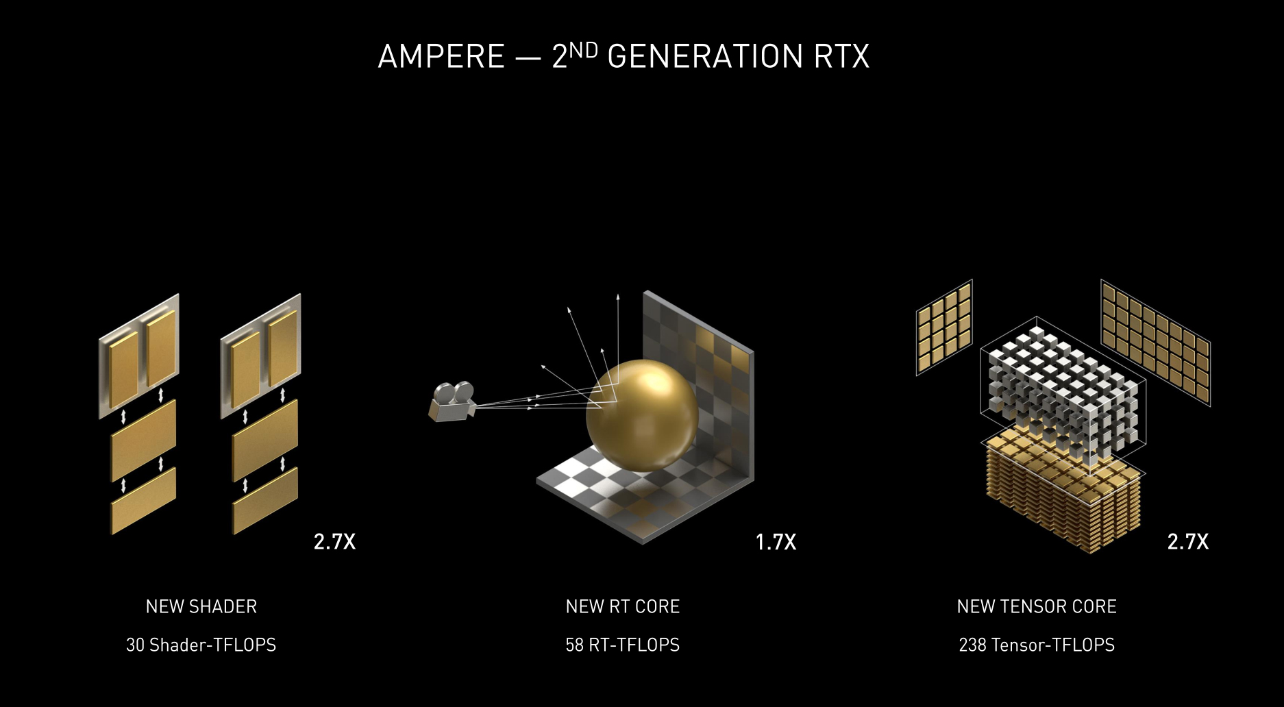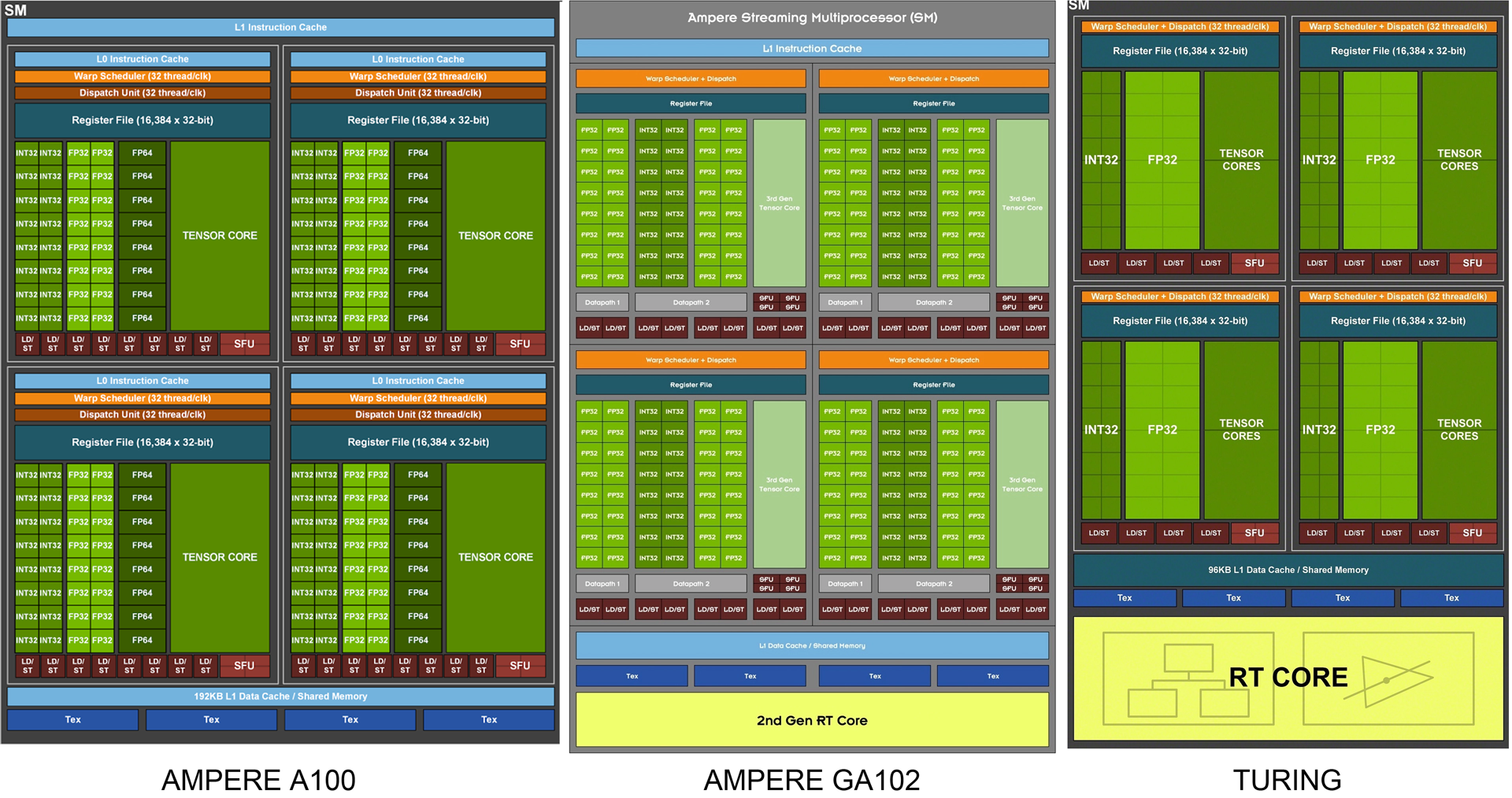 Ключевым изменением игровых GPU Ampere стало удвоение вычислительных блоков FP32 — по 128 на SM, плюс 64 блока INT32. При этом новый SM сохранил основную структуру старых SM. Это четыре массива обработки данных со своими диспетчерами и планировщиками задач, 4 блока выборки текстур и блок RT для ускорения трассировки лучей. В данном случае реализованы новые RT-ядра второго поколения с повышенной производительностью. Задействовано 4 тензорных ядра по типу NVIDIA A100. У Turing было по 8 тензорных ядер на в SM. Но тензорные ядра Ampere 3-го поколения обещают намного большую производительность.