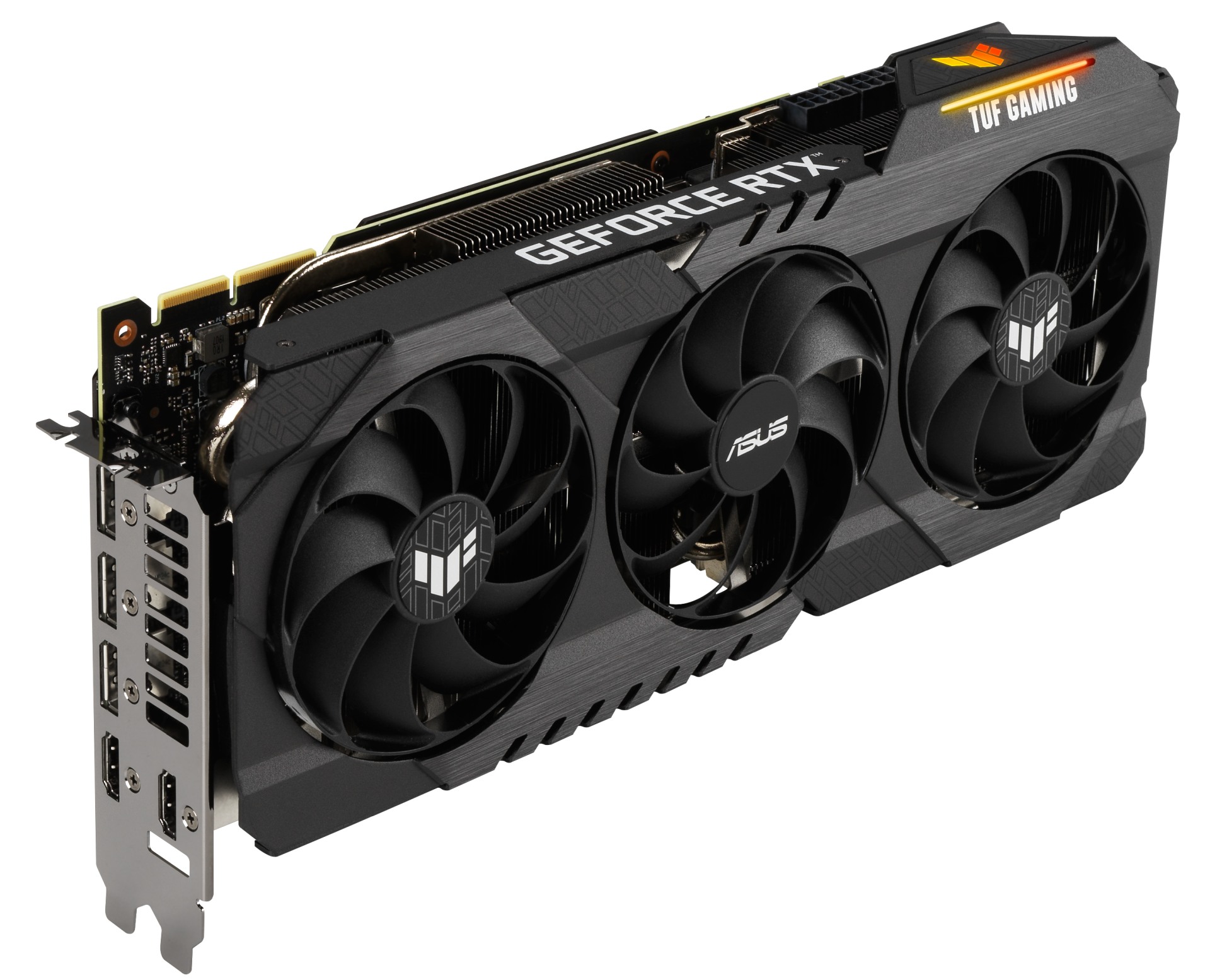 Если говорить о старших видеокартах от партнеров NVIDIA, то это зачастую трехслотовые варианты с тремя вентиляторами. В качестве примера можно взглянуть на ASUS TUF Gaming RTX 3090.
