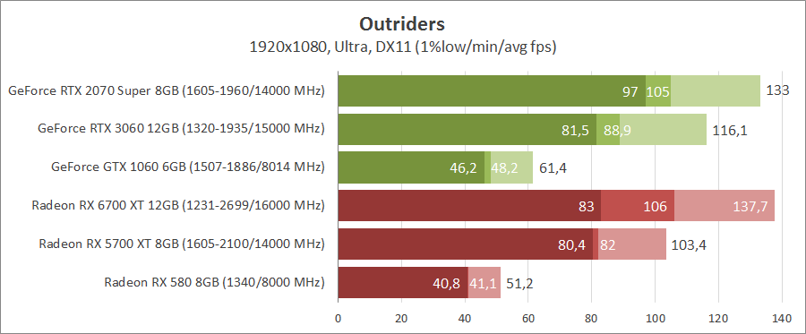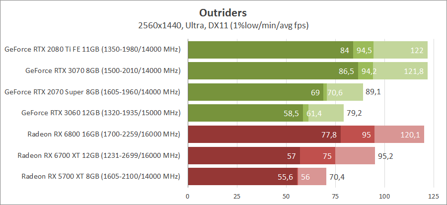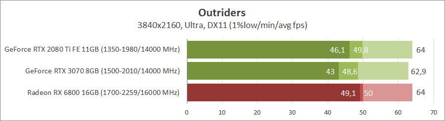 Системные требования Outriders сопоставимы с другими играми на движке Unreal Engine 4. Играть в Full HD можно на старых графических картах среднего уровня. Для высоких разрешений нужны старшие модели актуального поколения. Если говорить о результатах в нативном 4K, потребуются видеокарты не слабее GeForce RTX 3070, GeForce RTX 2080 Ti и Radeon RX 6800. Но на GeForce RTX еще можно активировать технологию DLSS, которая обеспечит серьезное ускорение в высоких разрешениях. И даже без учета DLSS в противостоянии прямых конкурентов преимущество на стороне «зеленых» ускорителей.