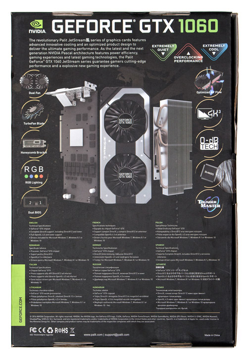 Ускоритель поставляется в большой картонной коробке, выполненной в характерной цветовой схеме оформления. С тыльной стороны перечислены ключевые особенности и преимущества карты: наличие двух BIOS, отключаемые вентиляторы с фирменным дизайном лопастей, поддержка разрешения 4К и т.д. Не забыли упомянуть и о настраиваемой системе RGB-подсветки.