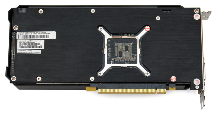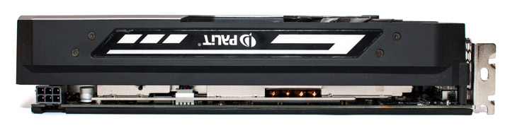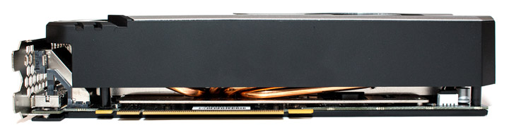 Габариты карты составляют 248x123х52 мм. Ее без проблем получится установить в большиснтво стандартных корпусов, в тоже время, при компоновке системы необхордимо учитывать, что в высоту кулер занимает 2,5 слота. Обратную сторону платы накрывает металлическая пластина, предназначенная для увеличения жесткости общей конструкции.
