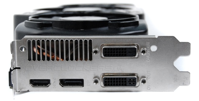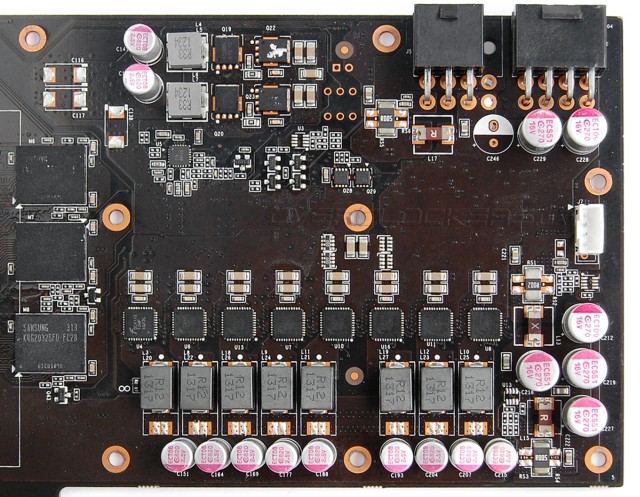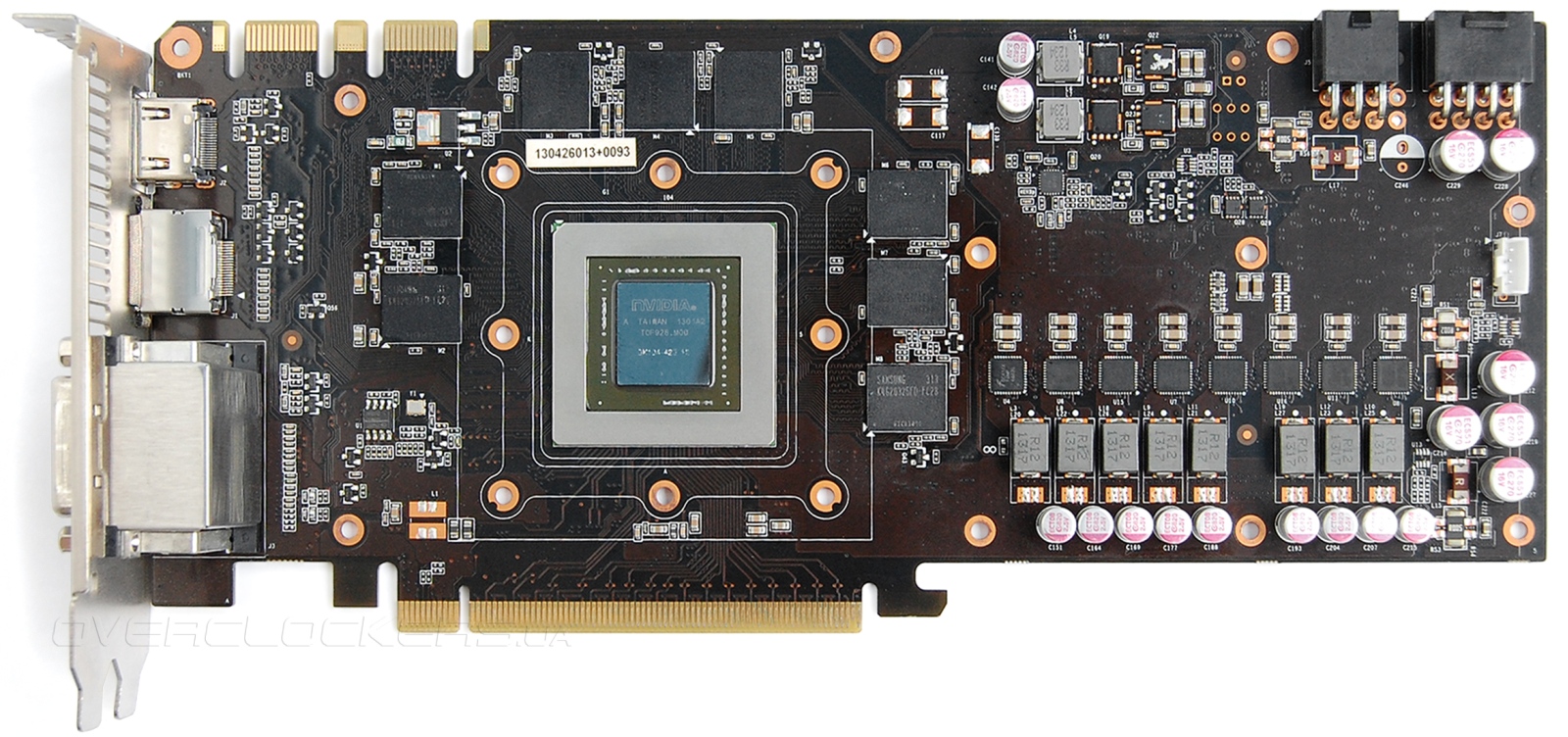 Процессор GK104 запитан от восьмифазного преобразователя напряжения. Память GDDR5 запитана от двух фаз. Два гигабайта памяти набрано восемью микросхемами Samsung K4G20325FD-FC28.
