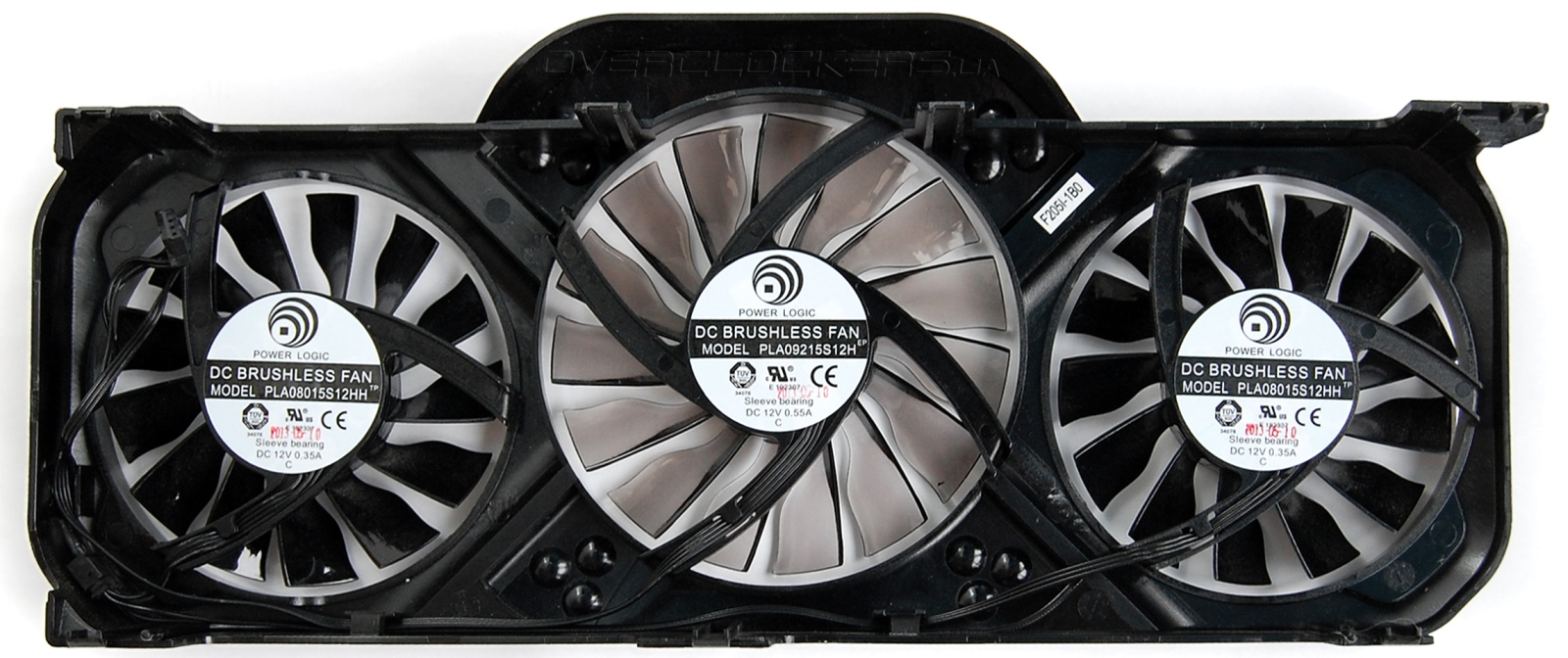 Пластиковый кожух крепится на защелки и снимается без полного разбора видеокарты. Это удобно, если вы решите почистить охлаждение от набившейся пыли. При этом сидит все плотно, и никакого дребезжания при таком безвинтовом креплении не возникает. Вентиляторы PowerLogic разного диаметра — боковые по 80 мм, центральный 92 мм.