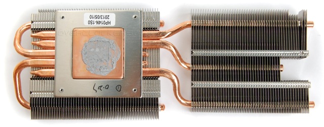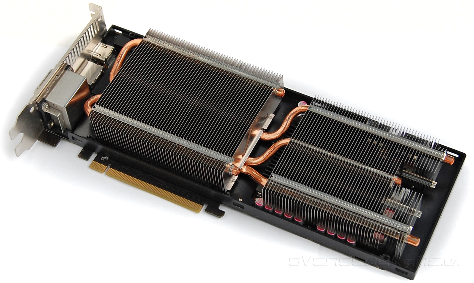 Тепло от графического чипа отводится через медную пластину, на которую напаяны пять тепловых трубок. Сверху всего этого находится самый крупный массив пластин. Другая секция «висит» на трех трубках сбоку.