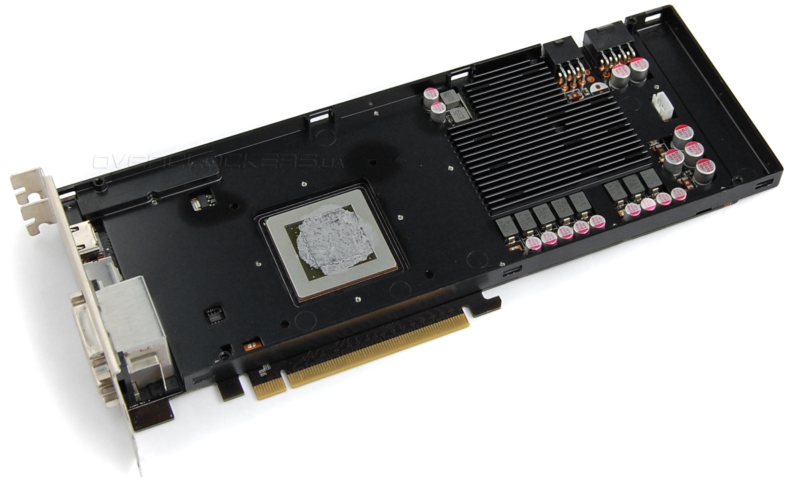 Вся лицевая сторона платы закрыта массивной черной пластиной, которая отводит тепло от силовых компонентов и микросхем памяти. В районе узла питания есть дополнительное оребрение для увеличения площади рассеивания.