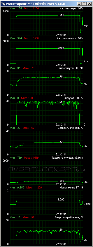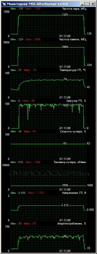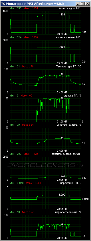 Для поддержания начального температурного режима и для сохранения стабильности в разгоне требуется небольшое повышение скорости вентиляторов, что и было сделано в режиме ручного управления через MSI Afterburner. Но это уже чревато высоким шумом.
