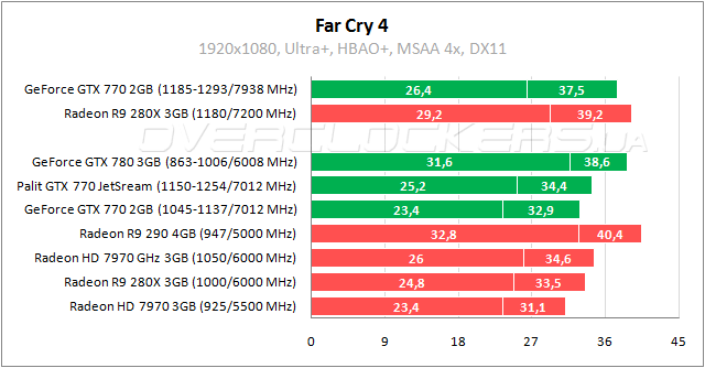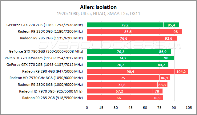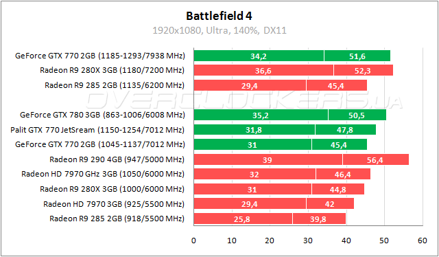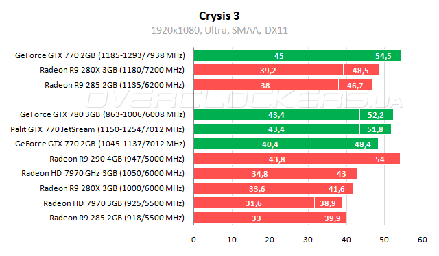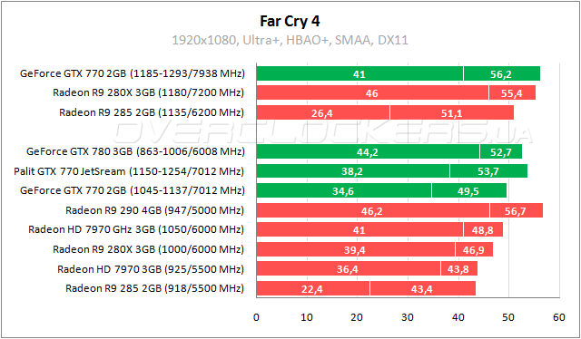 Мощные позиции у GeForce GTX 770 в шутере Crysis 3. Отставание от Radeon R9 290 на уровне 8–12%, отрыв от топовой версии Radeon HD 7970 составляет 13–16%. Radeon R9 280X со значительным разгоном едва дотягивает до конкурента в номинале. Palit GTX 770 JetStream на 7% быстрее референса и почти не уступает GeForce GTX 780.