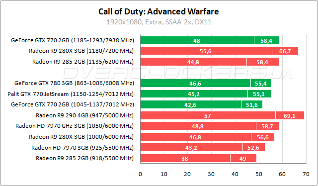 Полтора процента проигрывает GeForce GTX 770 старому Radeon HD 7970 в Advanced Warfare. Palit быстрее собрата на 5–7% и на пару процентов слабее Radeon R9 280X. Совершенно мизерное отставание Palit от GeForce GTX 780. В разгоне Radeon R9 280X выигрывает 14–16% у форсированного GeForce GTX 770. Последний при частотах 1185–1293/7938 МГц сопоставим с Radeon HD 7970 GHz Edition.