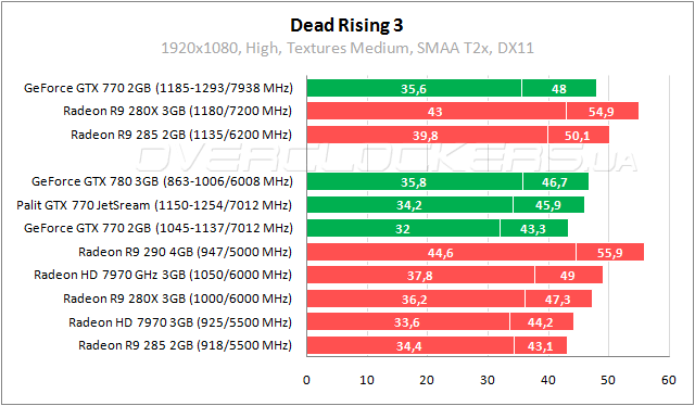 В Dead Rising 3 примерно на одном уровне находятся видеокарты GeForce GTX 770, Radeon R9 285 и Radeon HD 7970. Преимущество Palit над стандартным собратом до 7% при отставании 4–6% от Radeon R9 280X. С разгоном Palit не дотягивает до уровня Radeon HD 7970 GHz Edition в номинале, хотя повышение частот минимизирует разницу между ними. Стоит еще отметить, что достойные показатели видеокарты с двумя гигабайтами демонстрировали лишь при среднем качестве текстур. При высоком качестве начинались заметные подтормаживания, выводившие некоторых участников за пределы уровня приемлемой производительности.