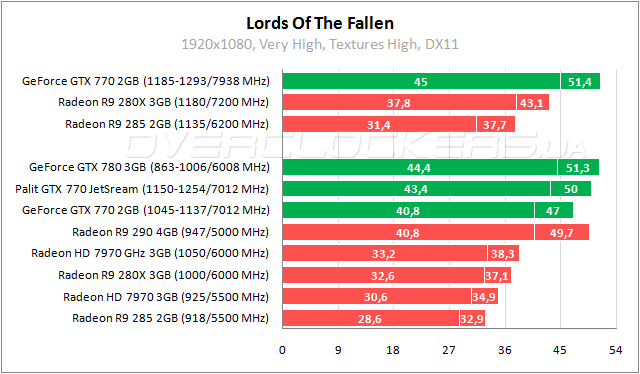 Графические решения NVIDIA доминируют в игре Lords Of The Fallen. GeForce GTX 770 сопоставим с Radeon R9 290 по минимальному fps. Отрыв от Radeon HD 7970 GHz Edition до 23%. Palit быстрее обычного собрата на 6% при отставании от GeForce GTX 780 в 2%.