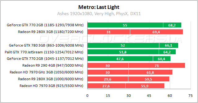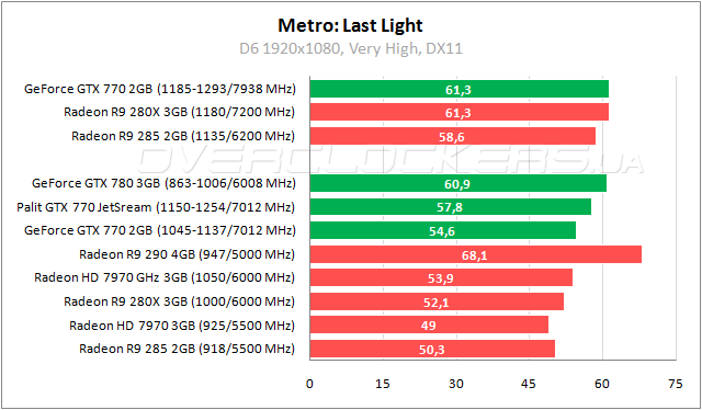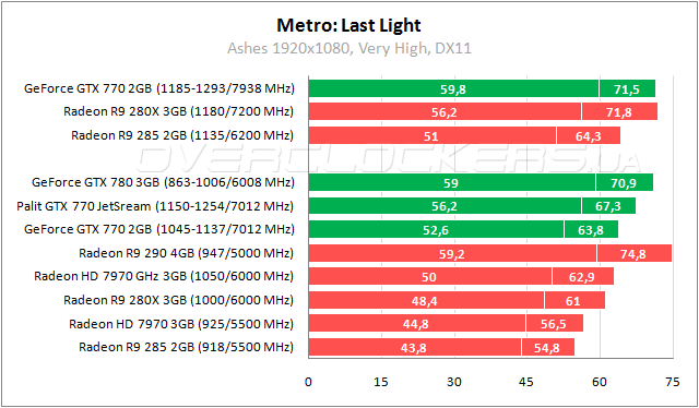 По результатам встроенного теста Metro: Last Light простой GeForce GTX 770 обходит старшую версию Radeon HD 7970 с мизерным преимуществом. Разгон позволяет повысить производительность относительно референсных частот до 12%, тем самым выиграть полпроцента у GeForce GTX 780.