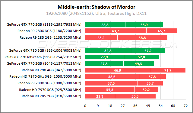 Игра Middle-earth: Shadow of Mordor известна своими жесткими требованиями к объему памяти. Даже при высоком качестве текстур (вместо Ultra) рекомендуется не меньше трех гигабайт. Огромный разрыв по минимальному fps между Radeon R9 285 и Radeon HD 7970 такие рекомендации наглядно подтверждает. Между GeForce GTX 770 и GeForce GTX 780 разница меньше, зато прирост минимального fps при повышении частот совершенно мизерный. И по этому параметру GeForce GTX 770 проигрывает Radeon HD 7970. При большем объеме памяти у GeForce ситуация могла бы сложится иначе.