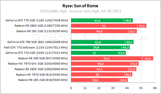Доминирование графических решений AMD в Ryse: Son of Rome. GeForce GTX 770 проигрывает даже Radeon R9 285 с разницей 3–4%, а у GeForce GTX 780 крошечный перевес относительно Radeon HD 7970. Разгон Palit до 1185–1293/7938 МГц позволяет минимизировать отставание от старшего напарника.