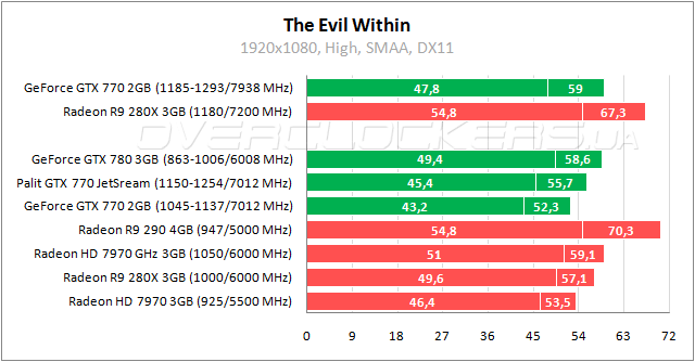 Новая игра в списке наших тестовых приложений. В The Evil Within простой Radeon HD 7970 выигрывает у GeForce GTX 770. Palit за счет заводского разгона сопоставим с Radeon R9 280X. При разгоне участников внушительный отрыв Radeon R9 280X относительно конкурента NVIDIA.