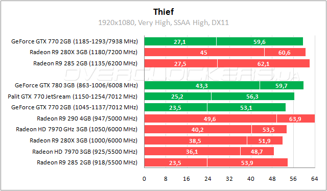 При самом тяжелом режиме сглаживания бенчмарк Thief задействует до 2,2 ГБ памяти, но этого достаточно, чтобы привести к редким, но значительным просадкам fps. Большой отрыв по минимальному fps графических карт на 3 ГБ от товарищей с 2 ГБ. И хотя GeForce GTX 770 по средней частоте кадров не уступает Radeon HD 7970 GHz Edition, по минимальному параметру проигрывает около 70%. В реальности все не так плохо и на GeForce можно играть без существенного дискомфорта. Если же понизить качество SSAA, то о падении производительности можно забыть вовсе.