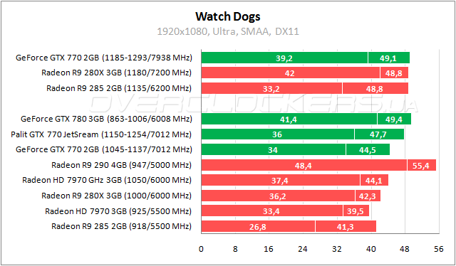 Резкой разницы между средним и минимальным fps в Watch Dogs нет, хотя игра при Ultra-качестве тоже требует три гигабайта. По среднему параметру GeForce GTX 770 лучше Radeon HD 7970 GHz Edition, а по минимальному незначительно обходит простой Radeon HD 7970. У Palit преимущество над обычным собратом до 7%, прирост от разгона 3–9%. Повышение частот сводит отставание от GeForce GTX 780 к минимуму. Лидером является Radeon R9 290.