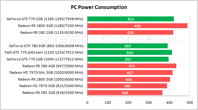Немного неожиданным выглядят большие результаты энергопотребления GeForce GTX 770 относительно старшего GeForce GTX 780. Причина в плавающей частоте последнего, которая резко снижается при превышении температурного лимита. С разгоном GeForce GTX 780 способен демонстрировать намного большие показания. Заводские параметры Palit, выступающего и в роли референсной версии GeForce GTX 770, тоже оказывают свое влияние на итоговую картинку. Общий же уровень энергопотребления у решений на GK104 и Tahiti в номинале близок. В разгоне Radeon самый прожорливый, что связано со значительным повышением напряжения, которое необходимо для высоких частот.