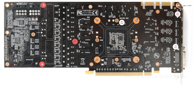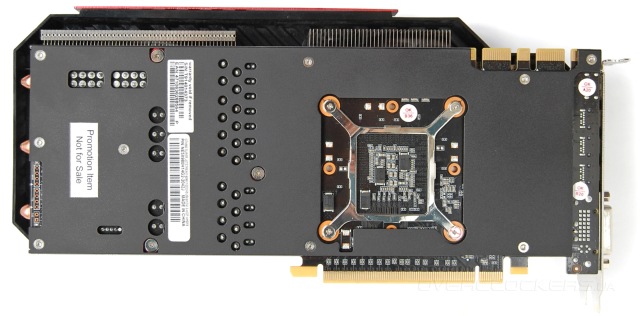 Задняя сторона накрыта пластиной из легкого металлического сплава. Этот конструктивный элемент придает жесткости всей конструкции и предотвращает деформацию текстолита под весом тяжелого охлаждения. Радиатором эта пластина не является и с электронными компонентами не контактирует.