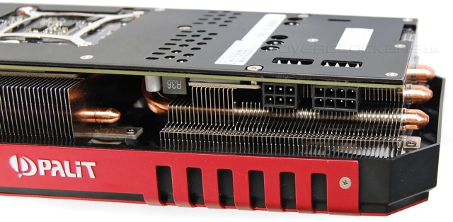 На боковой «козырек» кожуха, который накрывает выступающую часть широкого радиатора, нанесен логотип компании. В углу расположено два разъема для подключения дополнительного питания — на шесть и восемь контактов. У референса два шестиконтактных разъема.
