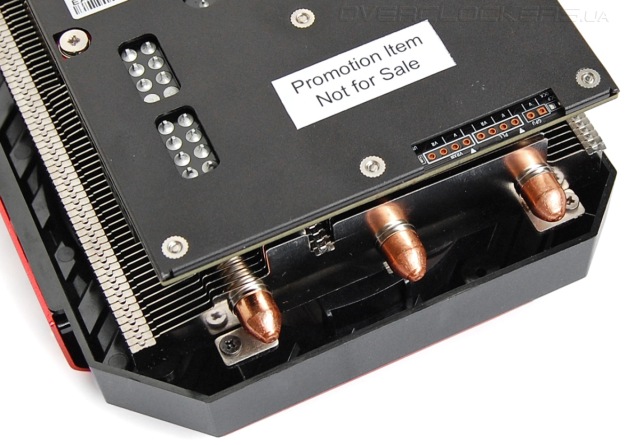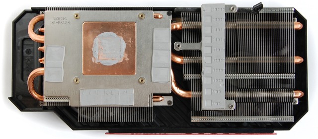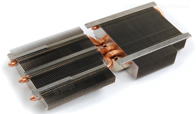 Радиатор пронизывают пять медных тепловых трубок. Три крупные трубки диаметром 8 мм несут на себе боковую секцию радиатор. Две трубки по 6 мм задействованы в теплообмене с той секцией, которая напаяна на основание. По углам обоих секций есть небольшие вырезы, чтобы открыть доступ к разъемам SLI и разъемам питания.