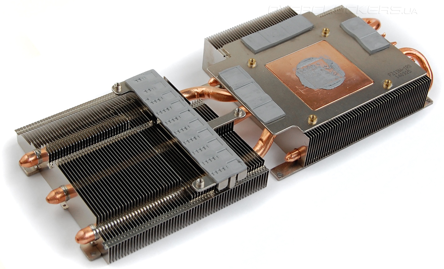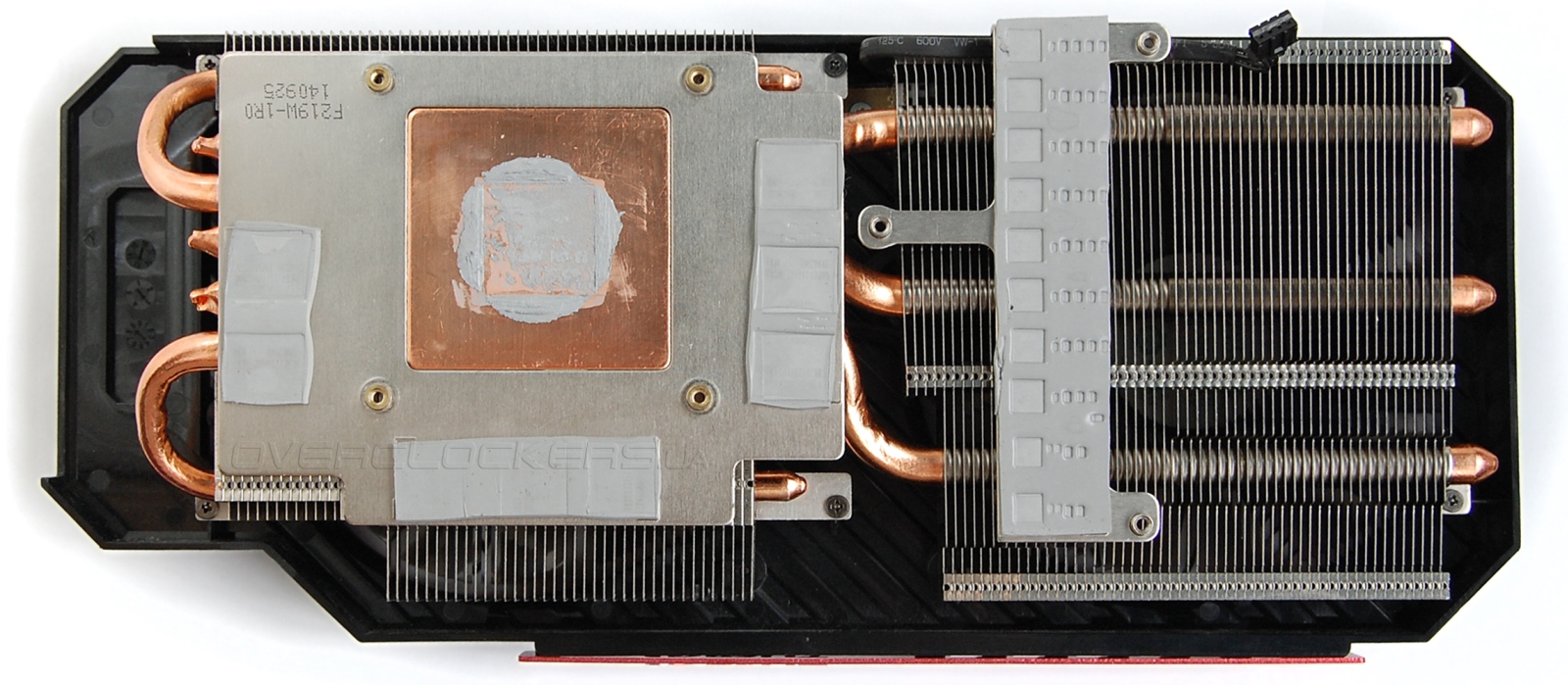 Давайте поближе взглянем на систему охлаждения. Под кожухом скрывается массивный двухсекционный радиатор с крупным основанием. Большая медная площадка контактирует с графическим кристаллом. Алюминиевая часть основания отводит тепло от микросхем памяти.