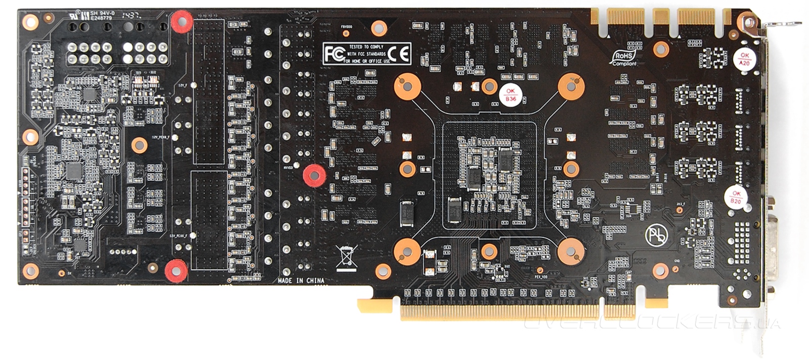 У края платы расположены точки замеров рабочих напряжений видеокарты. Это будет актуально для оверклокеров, практикующих аппаратные модификации и экстремальный разгон.