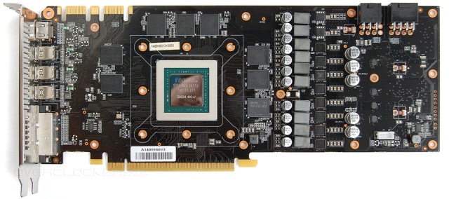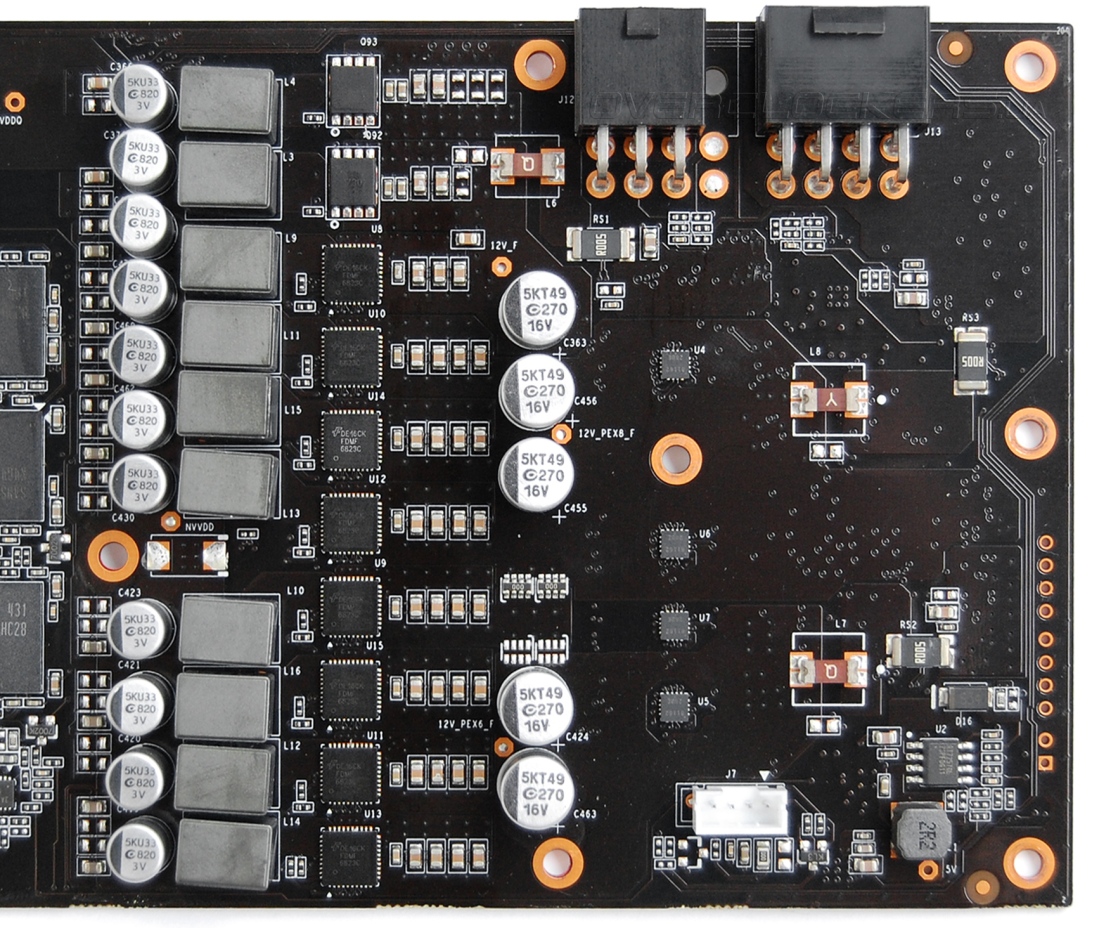 Реализовано восьмифазное питание графического процессора с использованием интегральных сборок DrMOS. Подсистема питания памяти насчитывает две фазы. Контроллеры вынесены на обратную сторону платы.