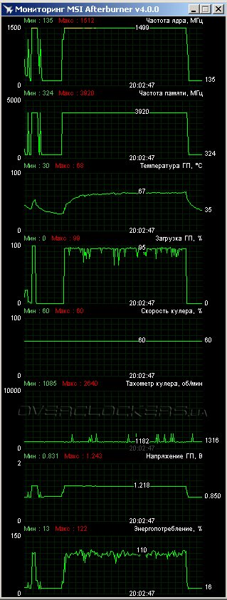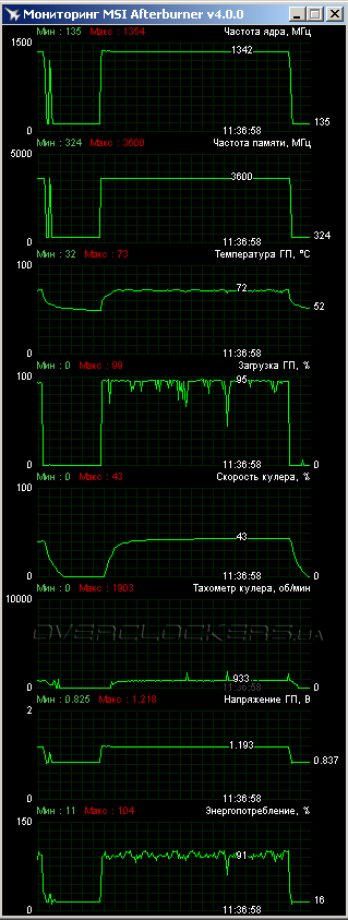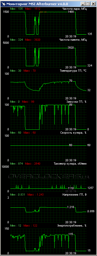 Для улучшения охлаждения обороты вентиляторов были зафиксированы на уровне 1200 об/мин. Это позволило даже немного снизить нагрев относительно начальных показателей. При повышении лимита мощности частота Boost ниже 1499 МГц не опускалась. Если и были отклонения в меньшую сторону, то очень редкие.