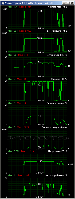 Пиковое значение Boost достигает 1354 МГц, но основное время ядро карты работало на стабильной частоте 1342 МГц. В бенчмарке Metro: Last Light температура не превысила 73 °C при 23 °C в помещении. Far Cry 4 разогрел ядро до 74 °C.