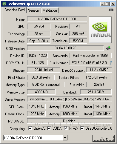 Super JetStream от Palit GTX 980 JetStream отличается повышенными рабочими частотами. Процессор установлен на базовую частоту 1203 МГц при Boost Clock 1304 МГц. Самое приятное, что заводской разгон коснулся и памяти. Ее эффективная частота повышена до 7200 МГц.