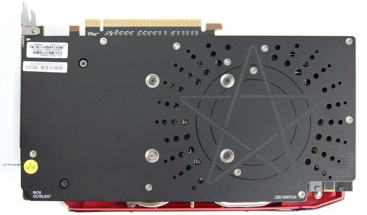 Кулер накрыт красным кожухом в обрамлении черного металлического «панциря». Общая длина видеокарты 25,5 см.