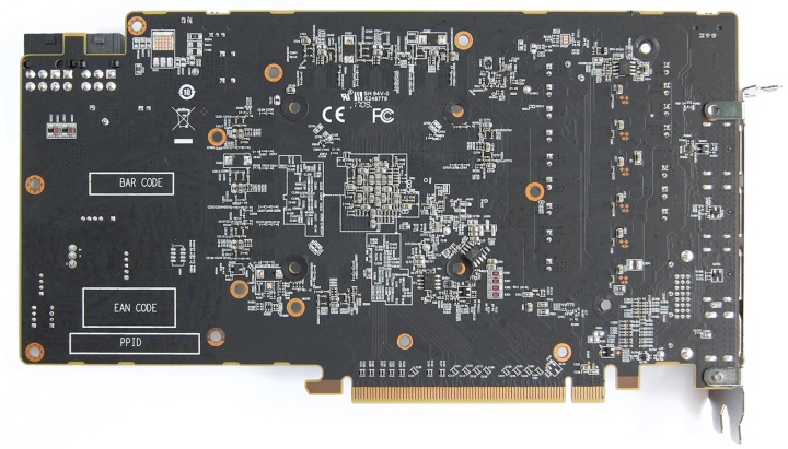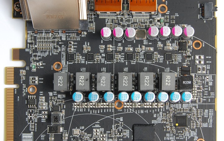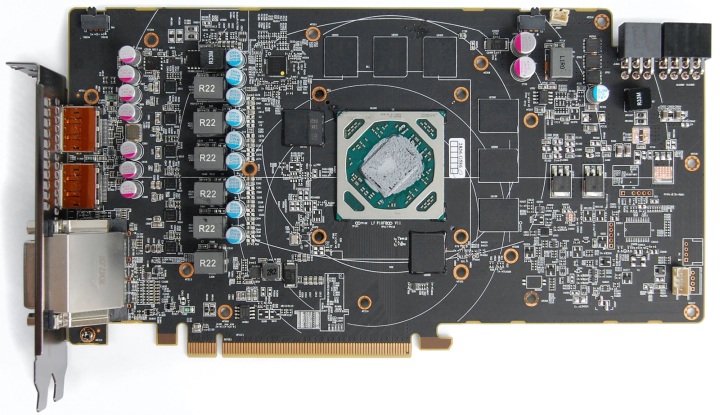 Система питания GPU расположена в левой части платы, ближе к видеоразъемам. На плате и на двух чипах GDDR5 заметны остатки какого-то лака. На работоспособность это никак не влияет, но такая неопрятность выглядит несколько неожиданно на фоне высокого статуса данного продукта.