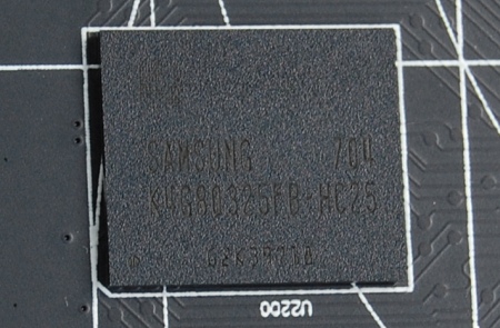 Общий объем памяти в 8 ГБ набран восьмью микросхемами Samsung K4G80325FB-HC25.