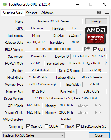 PowerColor Red Devil Golden Sample работает при частоте ядра 1425 МГц, что на уровне максимального разгона недавно протестированной видеокарты Sapphire Pulse Radeon RX 580. Стандартные спецификации предусматривают Boost-частоту до 1340 МГц при базовом значении 1257 МГц. Эффективная частота памяти 8 ГГц, тут обошлось без заводского разгона.
