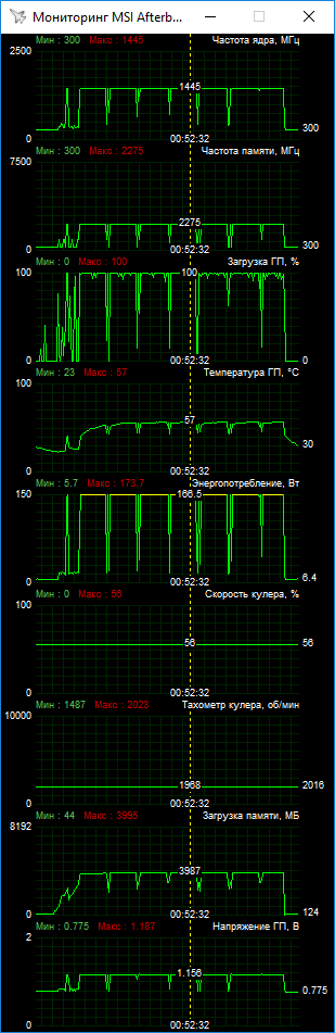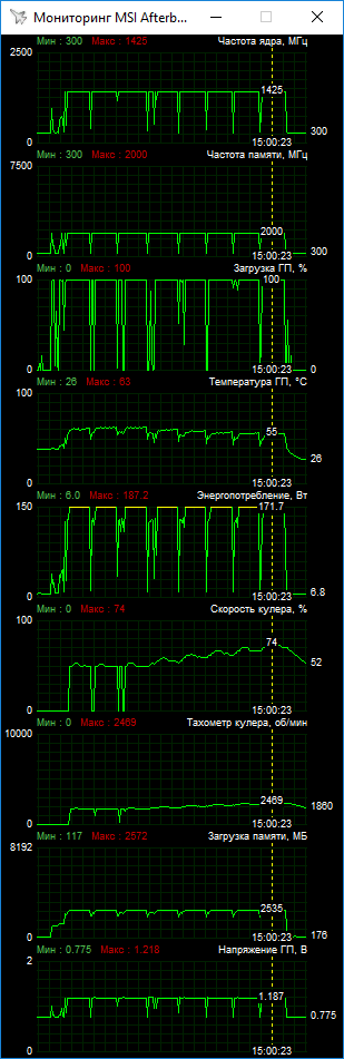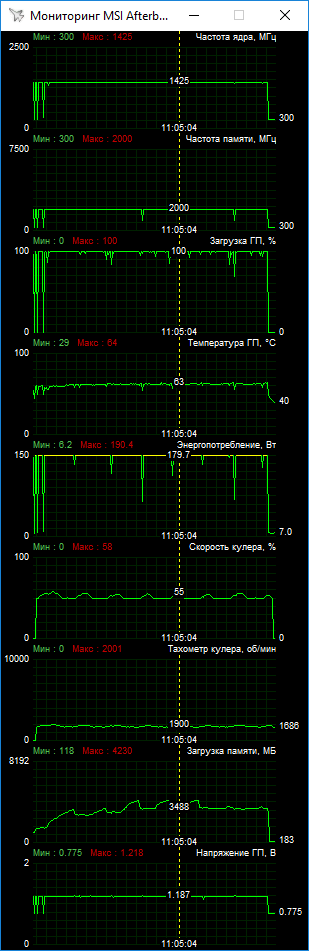 Разгон ядра с 1425 МГц до 1445 МГц потребовал повышения напряжения на 24 мВ для стабилизации видеокарты. Более серьезное повышение напряжение негативно влияло на общую стабильность.