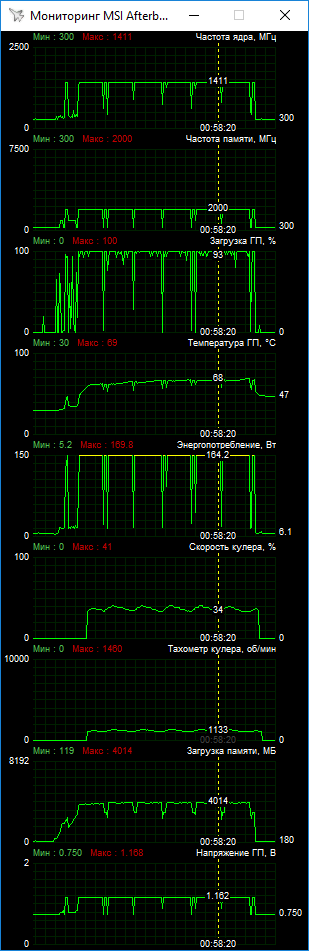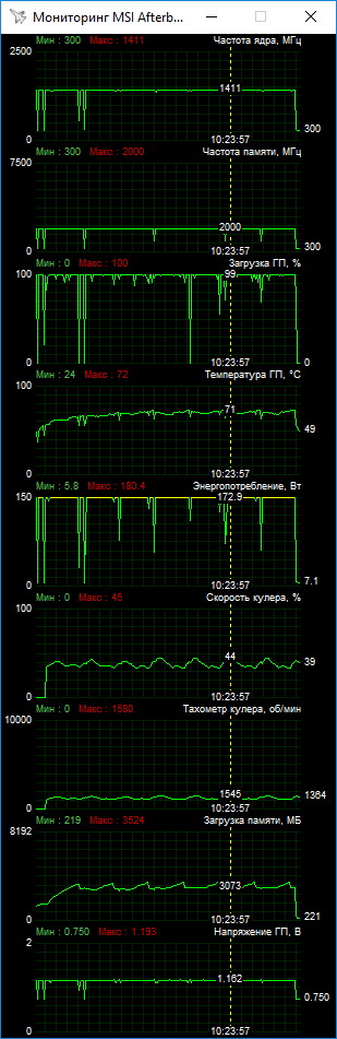 Переключение в режим Silent сразу сказывается на рабочих характеристиках. Частота устанавливается на уровне 1411 МГц. Температура в игровом режиме немного повышается, но серьезно снижается скорость вентиляторов. Например, в Deus Ex: Mankind Divided вентиляторы работали в диапазоне 1100–1400 об/мин, а при нагрузке бечнмарком The Division даже пиковая скорость ниже 1600 об/мин. Все это проиллюстрировано на скриншотах ниже.