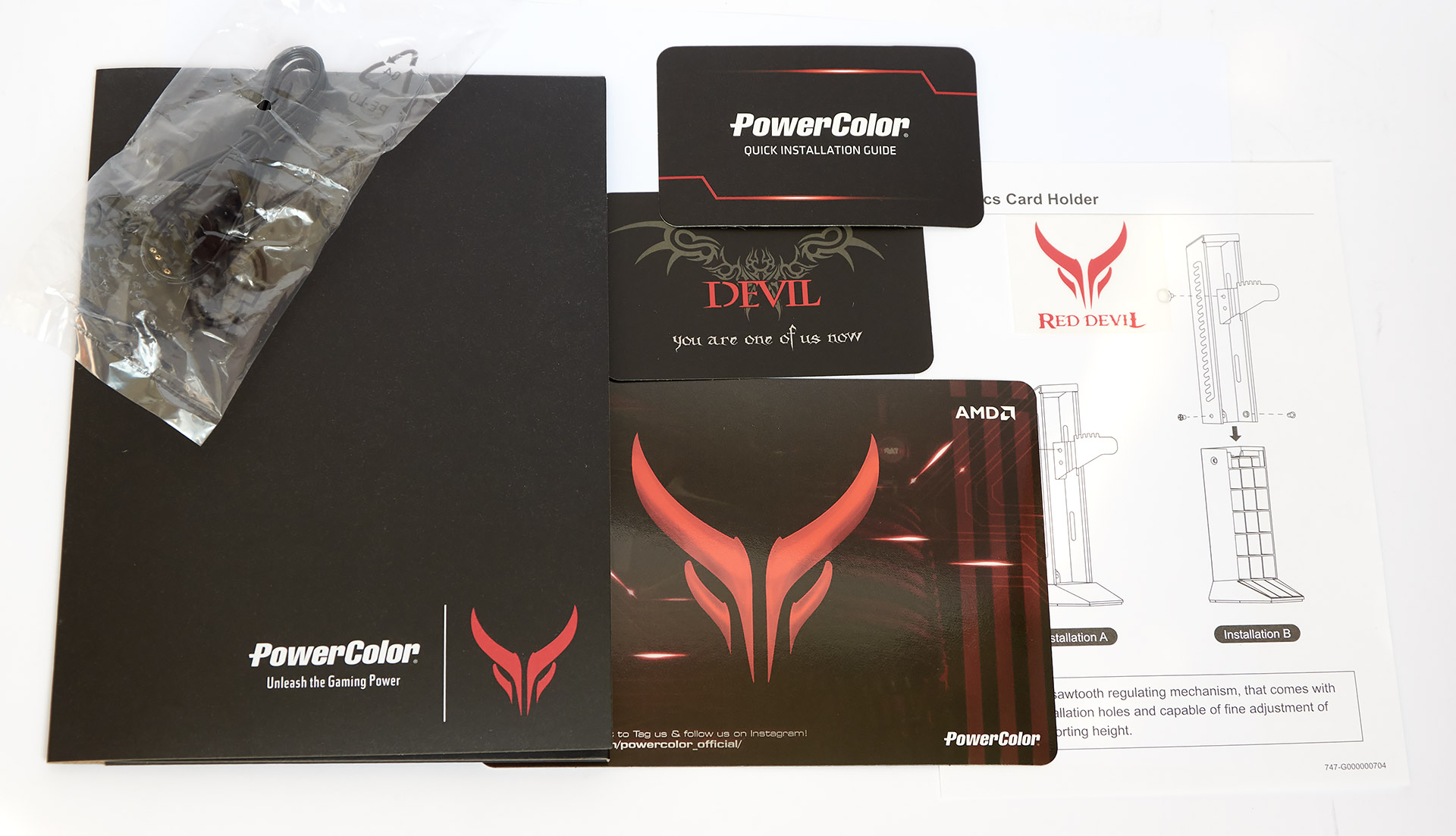 В отдельном конверте находятся инструкции и карточки продукта с QR-кодом для регистрации и участии в конкурсе на лучшее фото с видеокартой PowerColor Red Devil. Есть кабель-переходник для подключения подсветки к материнской плате.