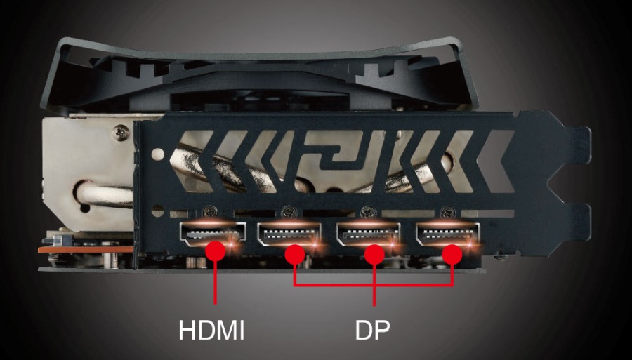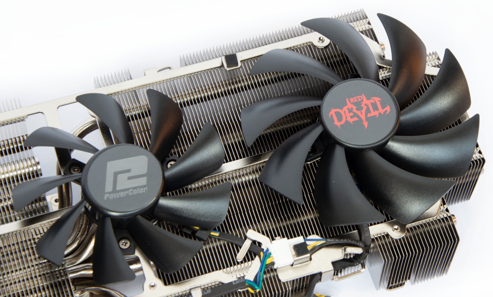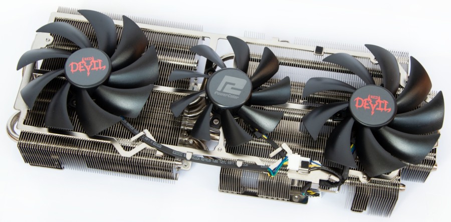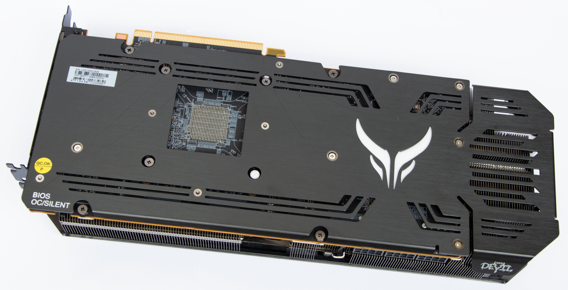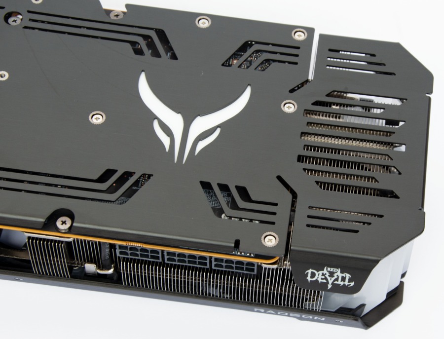 На пластине есть подсвечиваемый логотип Red Devil. Сбоку, где нет платы, предусмотрены прорези, чтобы снизить сопротивление воздушным потокам внутри корпуса. Питание подключается к трем восьмиконтактным разъемам.