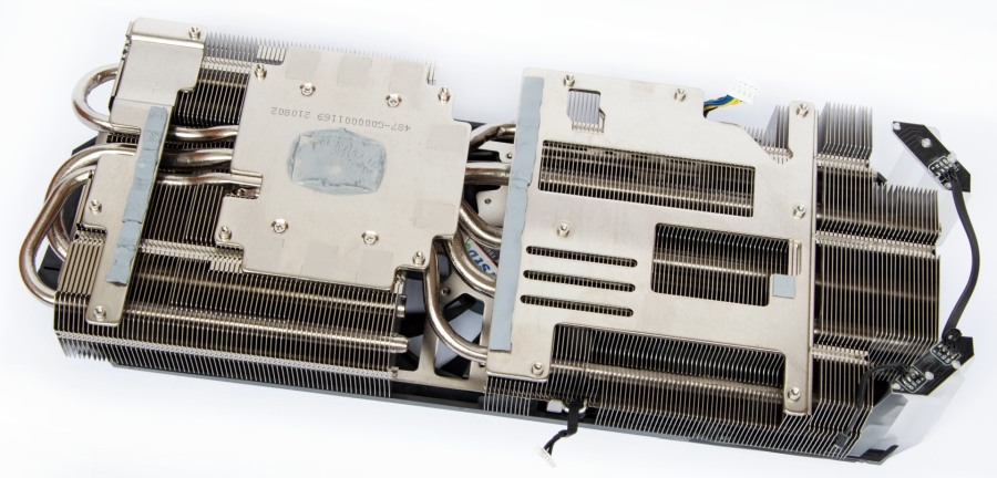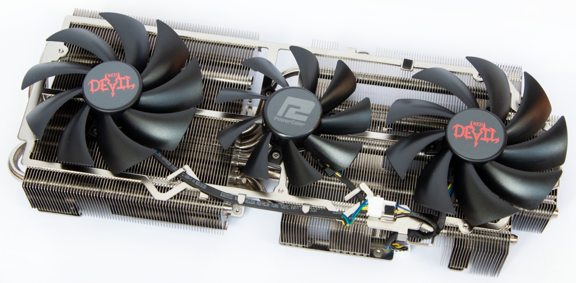 PowerColor использует единый радиатор для всех элементов. Для контакта с транзисторами и дросселями питающей цепей предусмотрены большие контактные площадки.